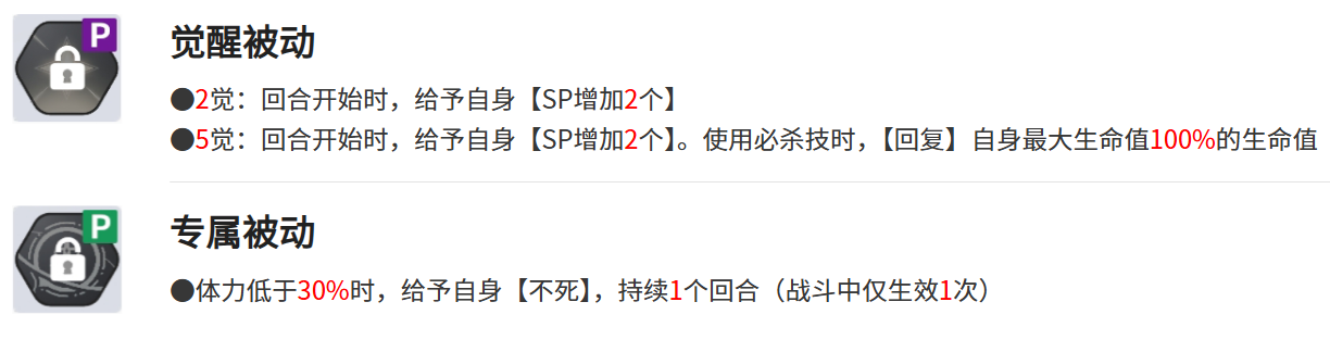 在被动方面,兰吉尔斯的觉醒技能表现亮眼:二觉时可直接获得2点SP;五觉状态下,使用必杀技后能恢复自身最大生命值的100%。而其专属被动则设定为当生命值低于30%时触发“不死”状态,大幅提高残局反打的可能性。