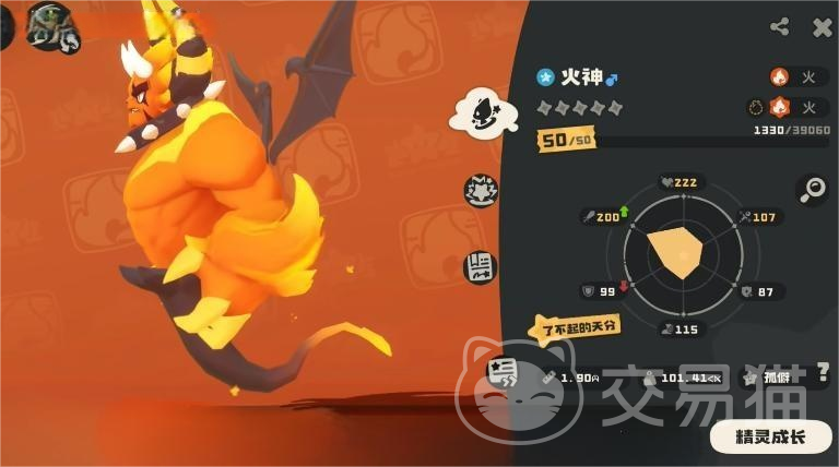作为初始三宠之一,火神无需通过野外捕捉或性格筛选即可投入培养,通常在等级达到50左右时便能习得核心技能组。其速度种族值为105,在多数PVE场景中只需简单提速即可确保先手权。同时具备优秀的双防与血量基础,经过潜能激发后更能承担较长时间的战斗压力,适合作为输出核心稳定站场。