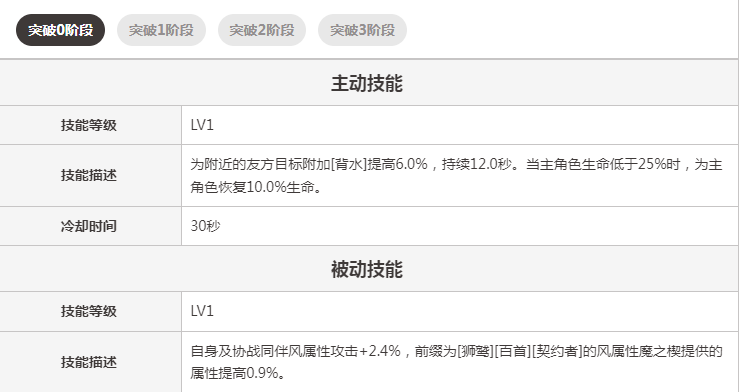 其被动技能具备成长性,在初始等级时即可提升自身及协战同伴的风属性攻击力2.4%。若队伍中存在前缀为契约者或狮鹫的魔之楔角色,额外获得0.9%的风属性攻击加成。随着技能等级不断提升,最终风属性攻击加成可达4.8%。这意味着当队伍中拥有2至3名风属性成员时,整体输出将获得可观的叠加增益,形成长期稳定的团队强化效果。