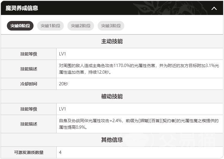 其被动技能则侧重于团队长期作战中的属性强化。所有光属性队友的基础攻击力都会受到被动加成,且当队伍中装备了特定前缀的光属性魔之楔时,该被动还能进一步放大这些魔之楔的属性收益,形成双重增益。这种机制使得她在光属性阵容中具有极高的战略价值,常被用作核心辅助角色。