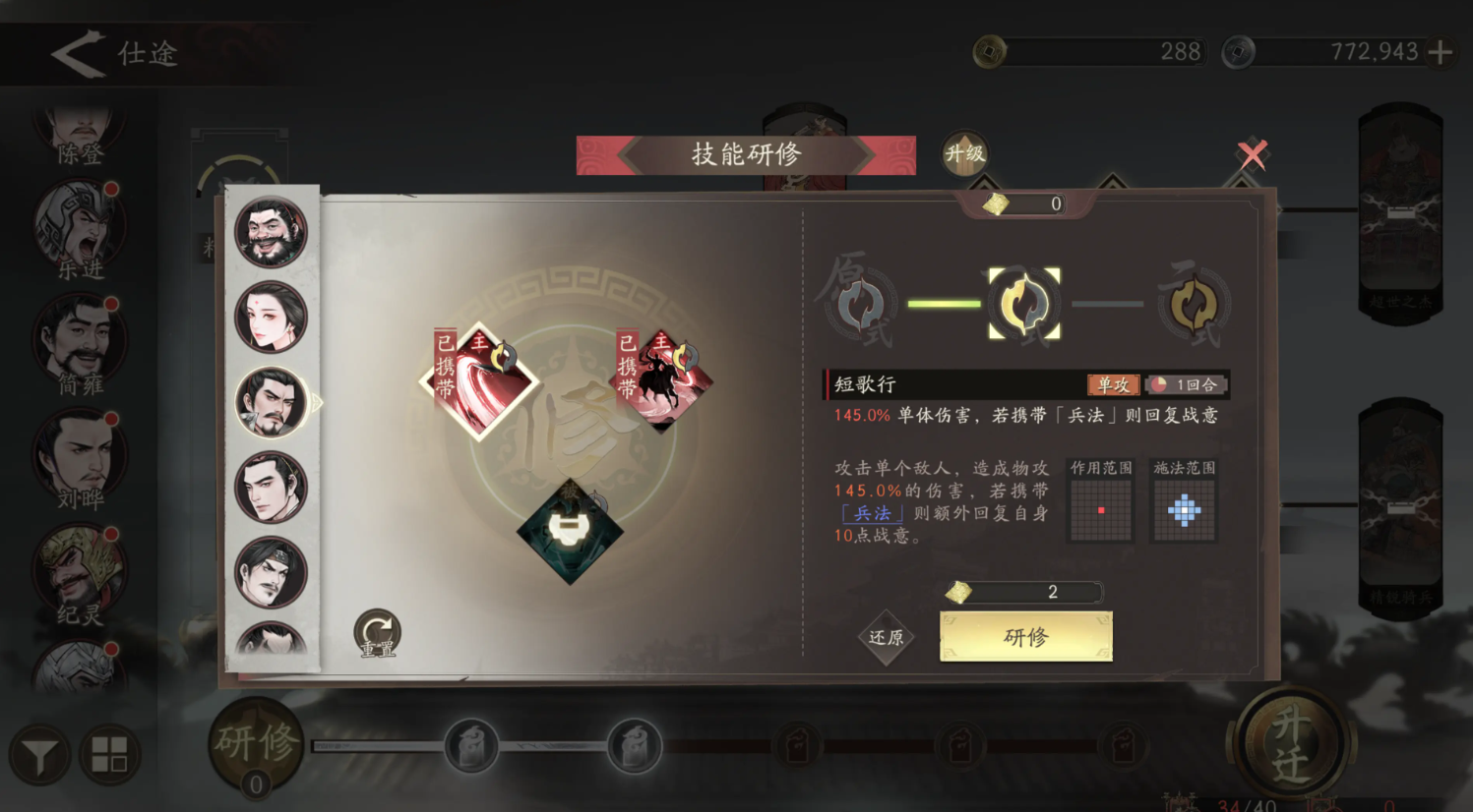两个通用被动分别为“袭扰”与“武锋阵”。前者提供8%物理攻击力加成,且每次主动攻击后可继续移动,大幅提升走位灵活性,便于衔接合击;后者适用场景有限,仅在队伍承受较高物理伤害压力且阵容以物攻型武将为主时才值得考虑携带。“奔袭”作为单点技能,实战价值较低,不推荐装配。