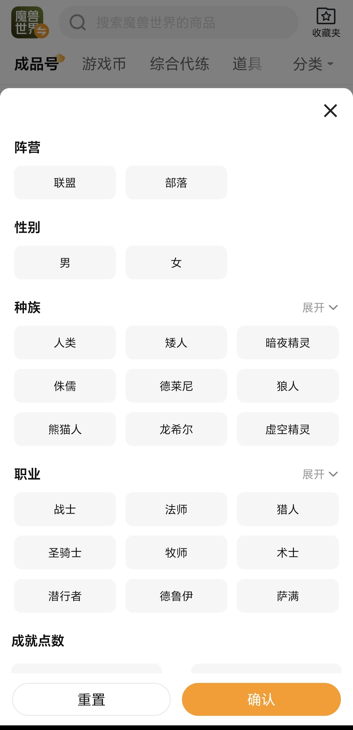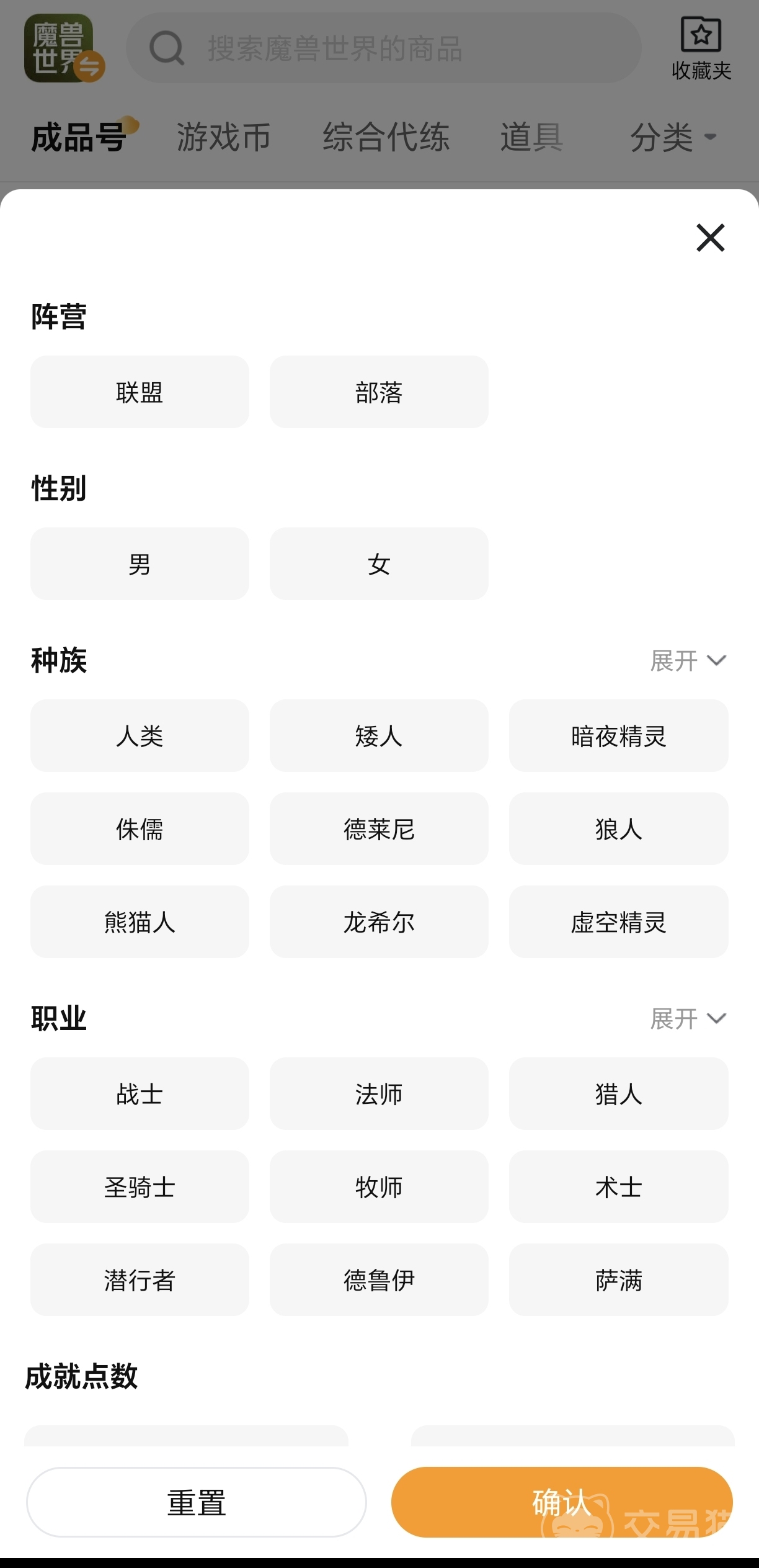 交易猫的魔兽世界专区提供了超便捷的一键筛选功能,让买家可以轻松锁定自己心仪的账号。无论你是想要战士、猎人、牧师、法师,还是死亡骑士等职业的账号,平台都能精准帮你找到。更值得一提的是,筛选条件不仅限于职业,玩家还可以根据性别、种族、成就点、稀有坐骑、极品幻化和修炼专业等多维度条件进行精确筛选,完全满足你对魔兽世界账号的各种个性化需求。无论是追求极品幻化,还是稀有坐骑,交易猫都能帮你轻松找到最符合要求的账号,让每一位玩家都能找到属于自己的完美角色。