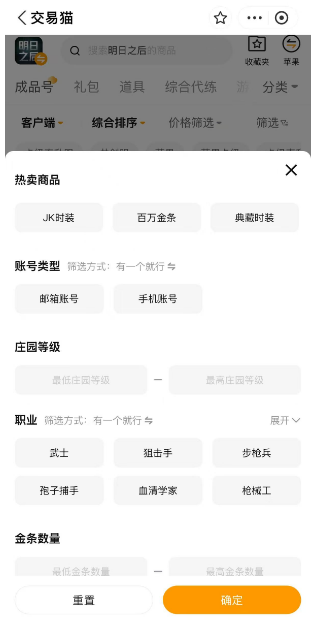 交易猫中的商品是很丰富的,就拿明日之后这款游戏来说,进入平台搜索游戏的名字,立刻就能进入专属专区,各类成品号、卡级号、道具号等各具特色的账号一目了然,大家很方便的就可以浏览查询。而且官服、渠道服等各种客户端服务器都能挑选,平台还支持精准筛选,大家能自行选定有典藏时装、指定战斗等级或稀有武器的账号,每款账号都标注详细的介绍,可以尽情的对比选择,卖家都经过了实人的认证,信用情况直接在主页展示,挑选对比起来更省心。