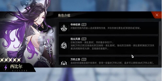 首推五星角色西比尔,雷属性输出核心,可在队伍中承担主C职责。她不仅具备高效的召唤能力,在持续输出方面也表现优异。其技能“夺神权柄”配合“指尖风暴”以及爆发性大招,能够有效打乱敌人行动节奏,并触发范围广泛的雷电伤害。无论是清理杂兵还是对抗精英单位,西比尔均展现出稳定的高伤害输出。该角色养成路径平滑,成型速度快,资源需求较低,无需复杂配队即可发挥强大实力,非常适合新人玩家作为开荒主力进行培养。
