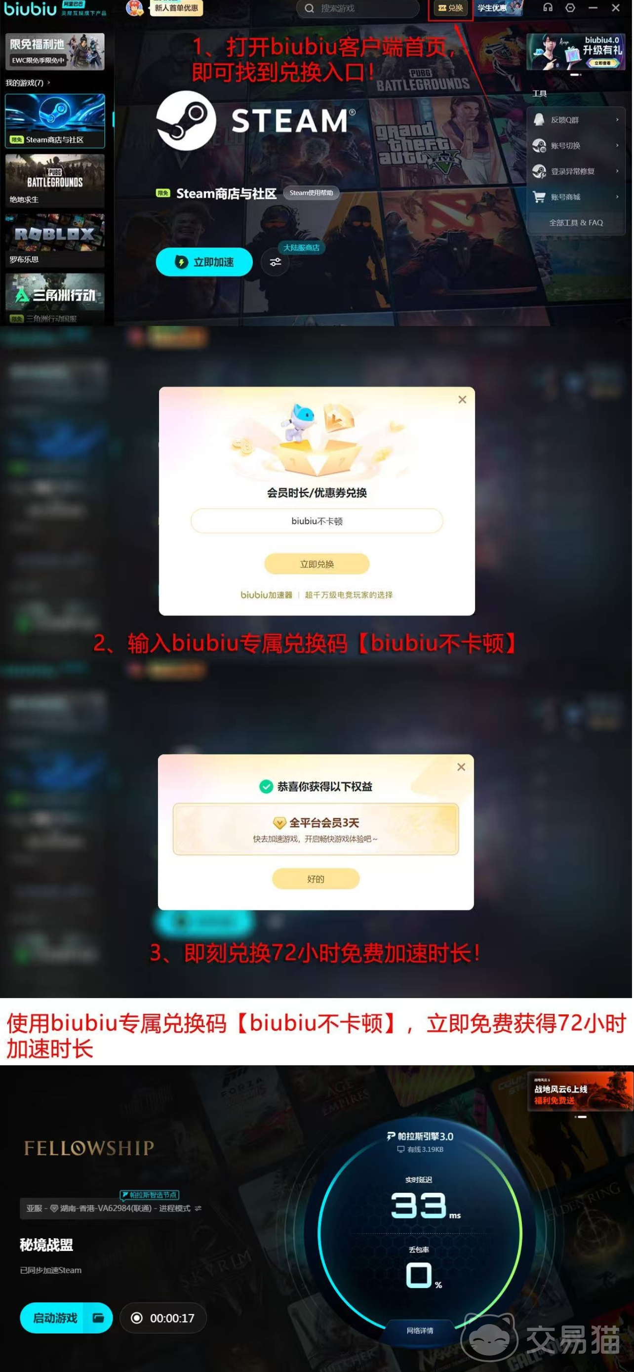 即便是首次使用的用户也无需顾虑,该平台为新用户提供了一项便捷福利:注册登录后即可领取24小时免费加速时长,此外所有用户还可获得额外三天的体验机会,只需在指定区域输入【biubiu不卡顿】即可兑换使用。