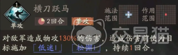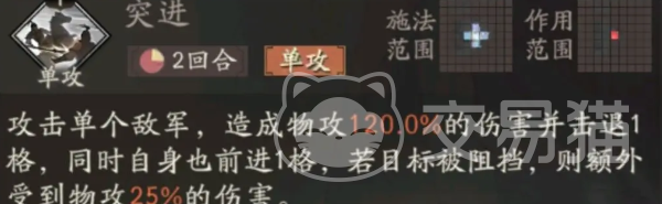 通用技能方面,“突进”是一项兼具位移与输出的功能性技能,可造成130%的单体物理伤害,并将目标击退一格,同时自身向前推进一格。若目标被地形阻挡无法后退,则额外承受20%的附加伤害。“铁马破阵”则以周围一圈单位为目标,造成50%的群体物理伤害,且对生命值低于50%的敌人伤害提升50%。但由于该技能作用范围为环形,站位要求较高,实际战斗中容易受限,因此多数玩家倾向于不携带此技能。