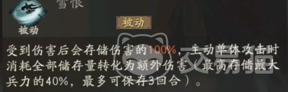 目前更为推荐的核心被动为“雪恨”。当夏侯惇受到伤害时,系统会记录所受伤害的等量数值并储存起来。当他发动主动攻击时,可消耗全部存储值转化为额外伤害,并根据消耗总量的35%恢复自身兵力,最高可存储相当于最大兵力40%的数值。该储存状态最多可持续3个回合,经过升级强化后,整体续航与爆发能力均得到明显提升,使其成为集反伤、吸血于一体的高容错率前排单位。