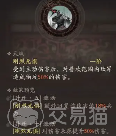 夏侯惇的核心天赋为“刚烈无惧”,该效果会在他受到主动伤害后触发。一旦触发,可在普攻范围内对敌方单位造成相当于自身物攻50%的范围伤害。若后续完成升迁操作,此技能还将额外提升18%的兵力加成。不过需要注意的是,该天赋依赖于近身受击才能激活,面对远程高频输出阵容时触发概率较低,实战中可能难以发挥应有效果。因此建议玩家要么不投入过多资源培养,要么直接将其升至五星,解锁回血机制,从而大幅提升其战场生存能力和续航表现。
