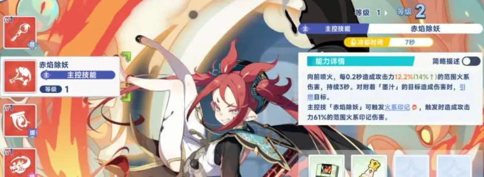 当与增益型角色协同作战时,赤霞的爆发能力将进一步放大。她可通过主动技能“赤焰除妖”向前方扇形区域持续喷射火焰,每0.2秒造成12.2%攻击力的火系伤害,持续3秒。若普通攻击命中敌人,则附加“墨汁”状态,此状态正是触发灼烧的关键条件。墨汁层数越高,额外伤害越显著。在积攒足够火系印记后,还可引爆墨汁,造成相当于61%攻击力的范围火属性伤害,进一步强化群体压制力。