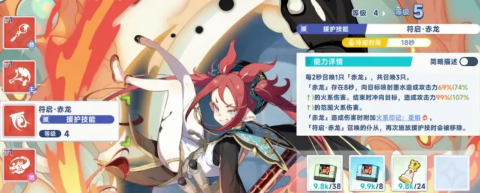 赤霞的援护技能为“召唤赤龙”,可周期性生成最多3只赤龙助战,每2秒召唤一只,单只持续存在8秒。这些召唤物将持续对敌方单位发动攻击,每次喷射造成69%攻击力的火属性伤害。在技能结束阶段,赤龙还会发起一次冲锋,成功命中时附加99%攻击力的范围火系伤害。同时,赤龙的攻击也能叠加火系印记,增强后续技能的连锁反应。