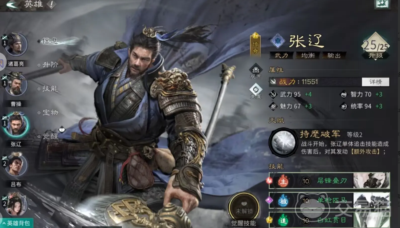 张辽作为一名突击型武将,拥有强大的单体输出能力和对弓兵阵容的克制效果。其基础属性面板优秀,在前期即可展现出较强的战斗力。通过参与“7日启程”活动,玩家可免费获取其碎片并快速完成初期培养。在缺乏马超或其强度不足的情况下,张辽可作为优质替代人选加入相关阵容。在后期战斗中,其实战表现往往优于马超。若成功解锁天赋3,还可与两名皇族武将协同作战,激活全能增益效果,进一步提升团队综合实力。