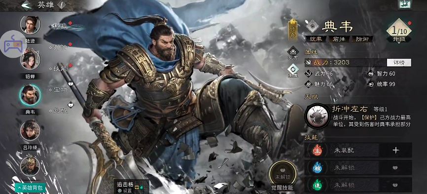 对于需要强化前排防御的阵容,典韦是理想人选。他凭借“折冲左右”技能可主动为队友分摊伤害,常被置于前排承担承伤职责。在吸收伤害的同时,他还具备反击能力,触发后可与其他武将形成追击联动。当处于追击格范围内时,能进一步提升队友输出环境,同时强化自身的防御技能,从而提高整个队伍的战场存活率。