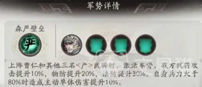 游戏内的军势系统也为曹仁提供了额外增益空间。利用曹操的军势可为曹仁叠加攻防属性,同时在主动进攻时触发额外伤害。值得注意的是,要激活曹仁相关的军势效果,队伍中必须包含至少两名步兵单位。推荐搭配曹洪与典韦这类高生存步将,能够充分激发军势联动优势。每场战斗仅能启用一种军势效果,因此应根据实际需求选择最契合当前阵容的军势配置,确保为曹仁提供最优支持。