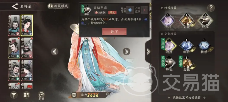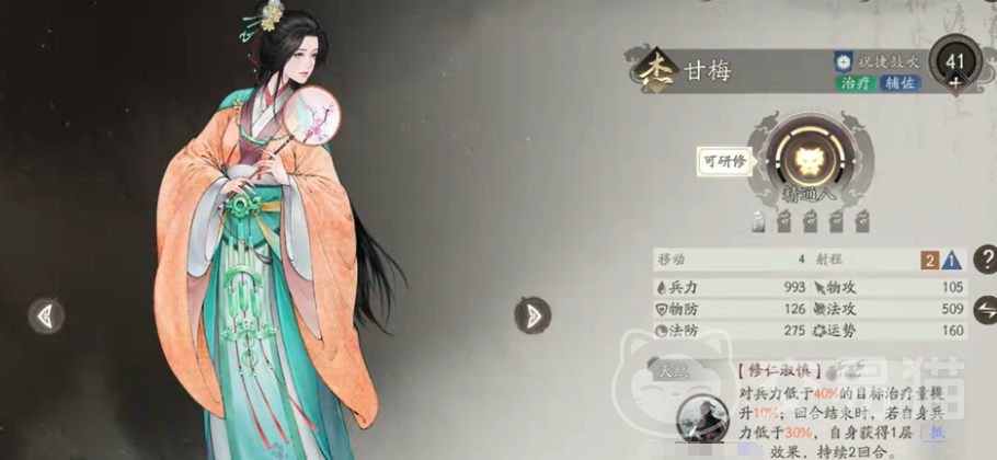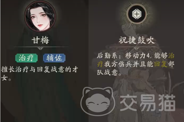 甘梅的核心优势体现在强大的治疗机制与辅助功能上。她不仅能持续为队伍提供稳定的兵力恢复,还能施加显著的减伤效果,有效提升前排单位的生存能力。此外,她在技能设计上具备驱散敌方增益状态的能力,同时可快速清除己方角色所中的负面状态,极大增强了团队的应变力。若将其配置为后勤型武将,还可获得移动力+4的额外加成,并具备治疗伤兵及恢复部队战意值的功能,进一步拓展了战术应用场景。