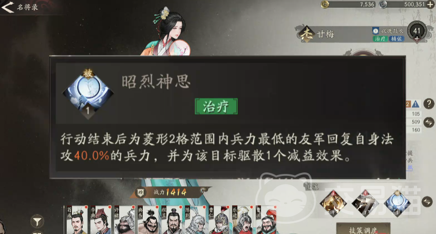 第一条路线是以治疗为核心的流派。在此体系下,重点强化她的回血频率与稳定性,确保队伍具备持久作战能力。推荐使用“昭烈神思”类技能,该技能可在每回合行动结束后,对周围两格范围内的友军进行治疗,优先选择兵力最低的目标,恢复其相当于自身法功40%的兵力值,并清除目标身上的一个减益状态。这种单体强疗搭配净化的效果,能在战斗初期迅速建立优势。