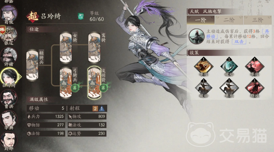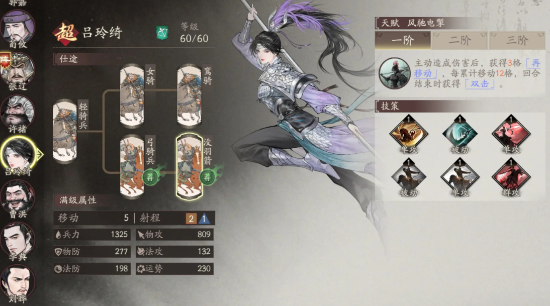 吕玲琦是当前版本中机动性最高的单体爆发型武将。当移动次数超过12次后,可触发双次攻击机制。若搭配具备连续攻击辅助的副将,并在开局即处于满怒气状态下,她能迅速突进并击杀敌方关键目标,完成斩首战术。