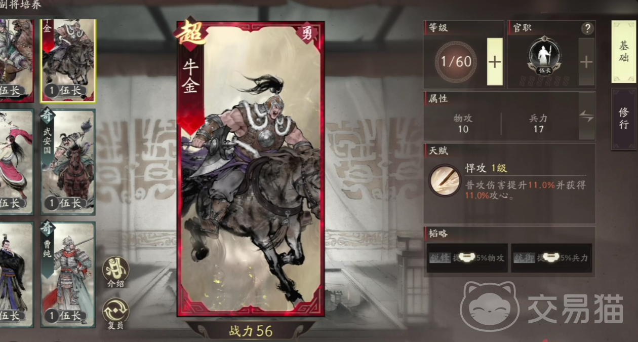 从基础属性来看,牛金初始具备10点物理攻击加成和17点兵力加成,数值均衡且具备一定生存能力。当玩家激活其韬略技能后,还可为全队带来5%的物理攻击力提升与5%的兵力增益,进一步强化整体队伍的输出与耐久表现。