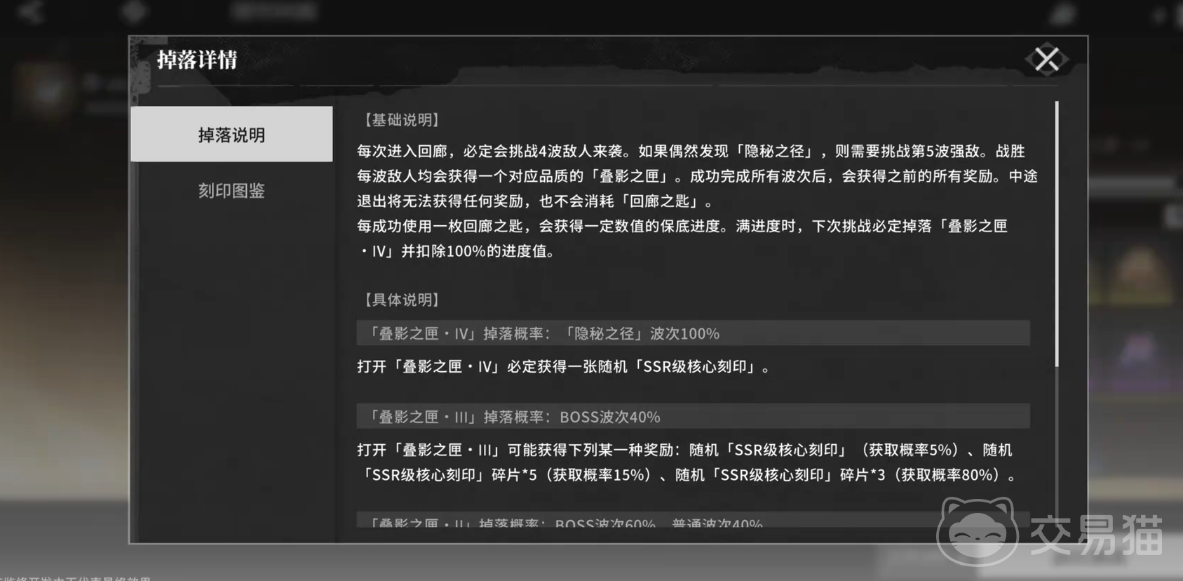 除了常规掉落刻印碎片外,刻印回廊还有几率直接产出完整的角色专属刻印,包括稀有的SSR品质刻印。此外,该玩法设有保底机制——“叠影之匣”。每次挑战都会增加进度值,当进度条积满后,下一次挑战必定获得一张角色专属刻印,但具体种类为随机抽取,无法指定目标。需要注意的是,即使未触发保底,每次挑战结束后开启奖励箱也存在小概率直接获取完整刻印的机会。