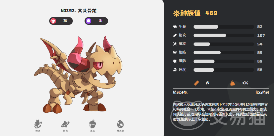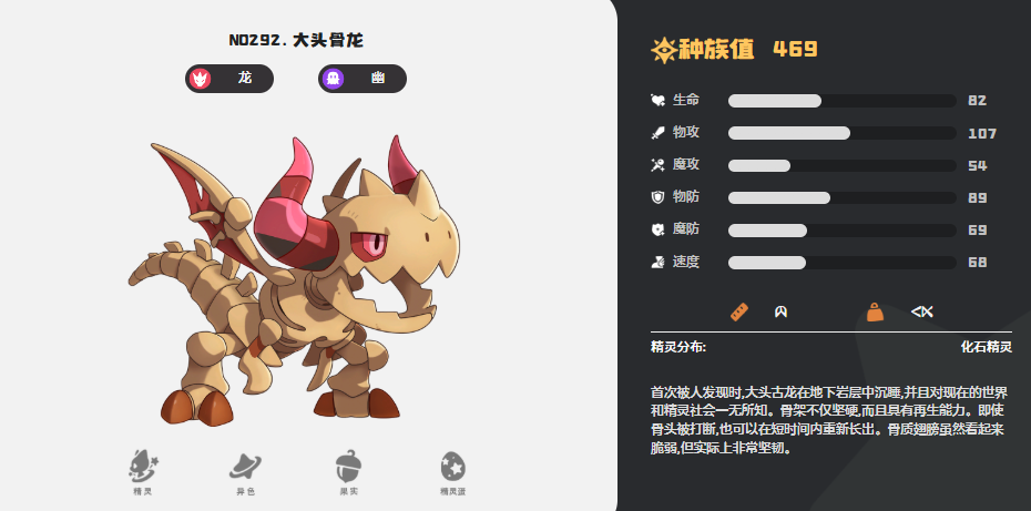 虽然大头骨龙通常不会被编入主力战斗阵容,但它在地图探索方面具备极高实用性。作为陆地移动工具,它能大幅提升角色的行进速度,支持频繁穿梭于不同区域之间。此外,该精灵具备跳跃技能,落地时不会造成生命值损耗,特别适合地形起伏较大的区域通行。其属性为龙系,在探索新地图时具有一定优势。需要注意的是,由于体型较大,在狭窄空间可能无法进入,但即便不进行进化,该精灵在整个游戏中期仍可发挥重要作用。
