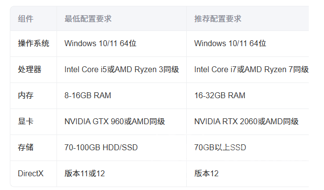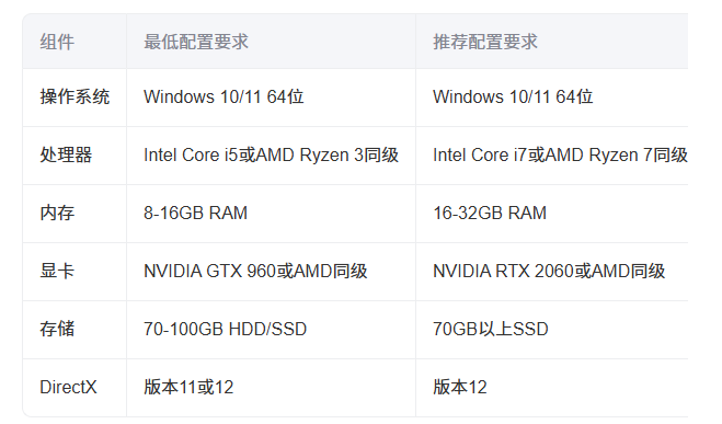 最低配置方面,建议使用Intel Core i5或同级别AMD处理器,内存容量不低于8GB,显卡需达到NVIDIA GTX 960水平,或选择性能相当的AMD显卡。游戏安装所需存储空间约为70GB以上,操作系统推荐Windows 10及以上版本,以确保系统兼容性和稳定性。