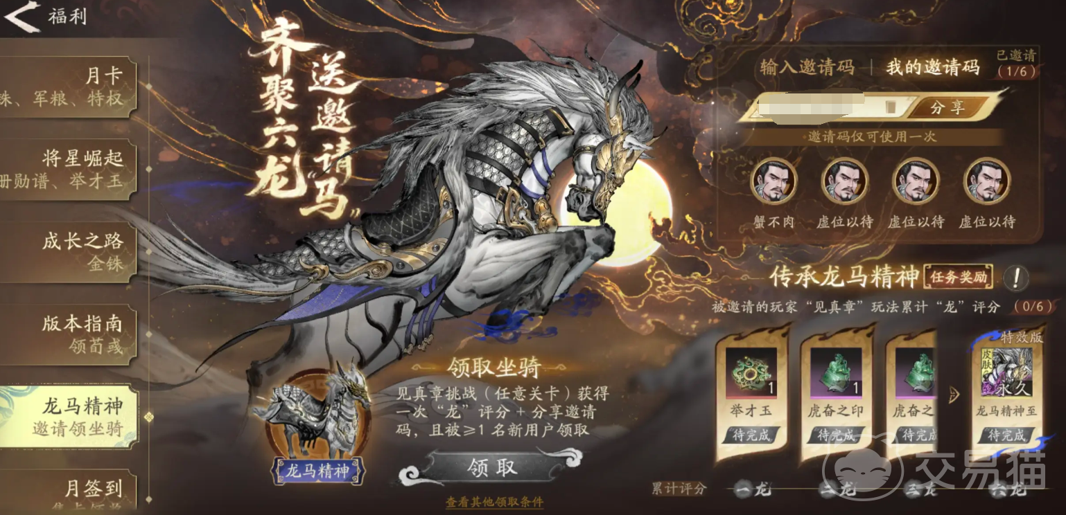 对于刚进入游戏的新手而言,“龙马精神”福利活动是不可错过的重点内容。通过邀请好友加入游戏,可逐步积累“龙”评分,当累计达到六个龙评分时,即可免费领取坐骑“龙马精神”。该坐骑具备出色的属性加成,尤其适合搭配高输出类型的武将使用,能显著增强战斗表现。