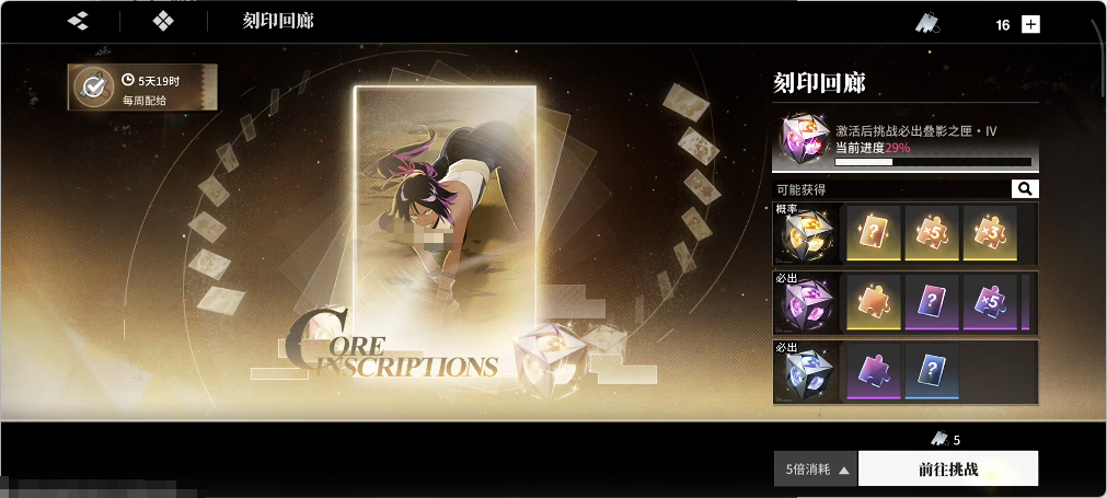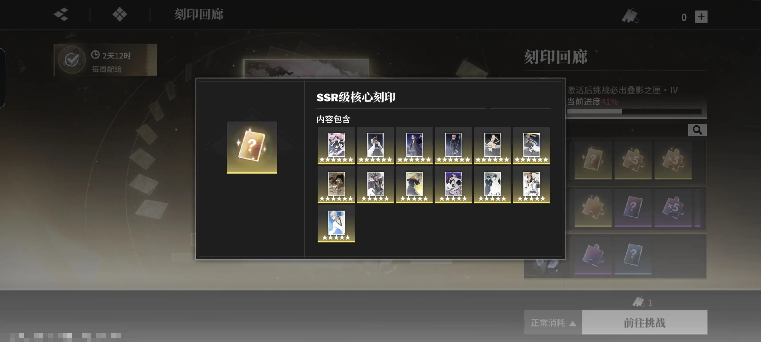 刻印回廊不仅产出碎片,还有概率直接掉落完整的角色刻印,省去合成步骤。同时,该系统设有保底机制:每次挑战都会累积叠影之匣进度,当进度条充满后,下一次挑战必定获得一张角色专属刻印。需要注意的是,该刻印从当前已拥有角色中随机发放,无法自主选择。