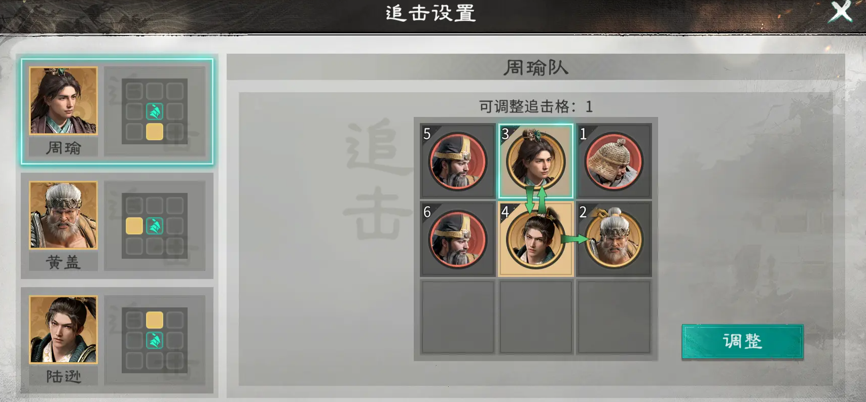 “追击格”系统是影响战局走向的关键机制之一。绿色品质及以上武将具备触发追击的能力,需通过合理站位使其踩中队友的追击格,从而激活额外行动机会。特别地,刘备、曹操、孙权三位武将拥有双追击格,可同时为两名队友提供追击支持,显著加快技能释放节奏,增强整体输出循环效率。
