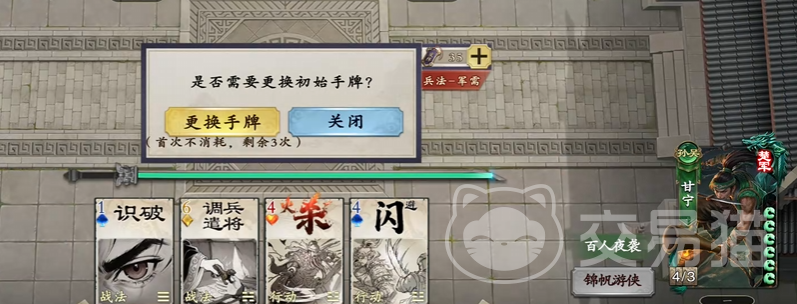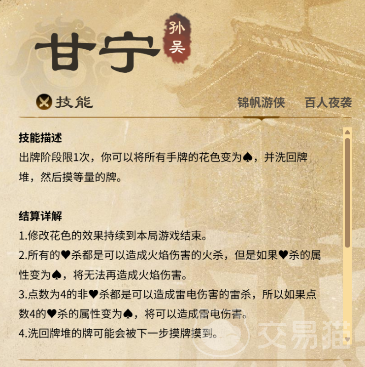甘宁的核心技能名为锦帆游侠,可在出牌阶段使用,每局限用一次。该技能允许玩家将手中任意数量的卡牌花色统一更改为♠,并将这些牌放回洗牌堆,随后抽取等量的新牌。虽然看似是一次手牌刷新操作,但实际上会对卡牌的花色进行永久性修改——即使后续被其他角色抽到,这些牌的♠花色依然保持不变,不过此效果仅在当前对局中生效。