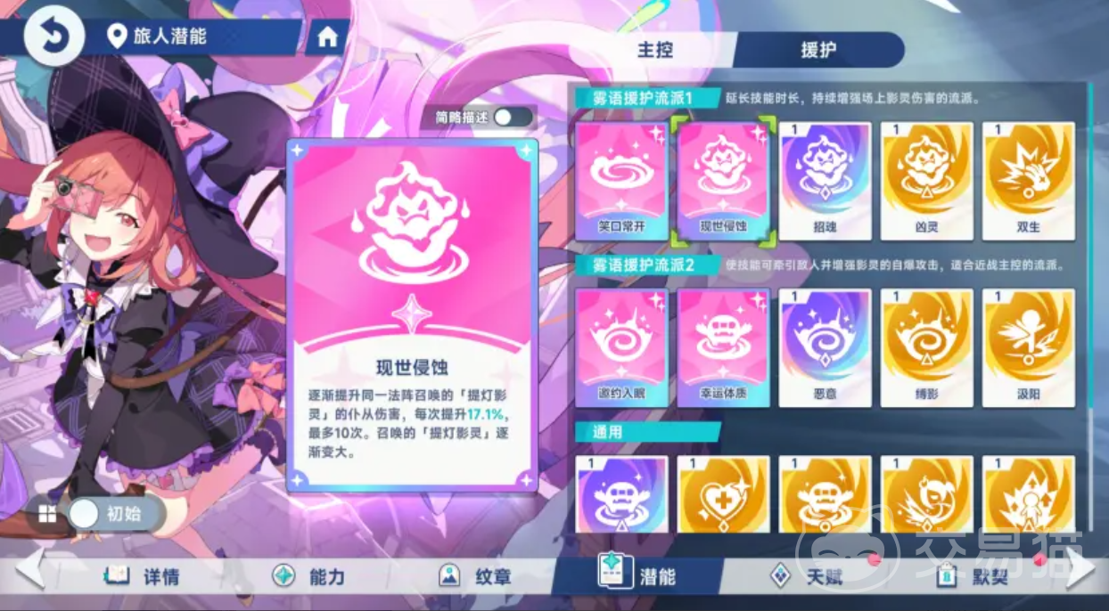 作为远程法术爆发型角色,雾语擅长通过持续性的暗系伤害压制对手。普通攻击“彗星连锁”可对敌人发动四次范围性暗属性打击。一技能“诡影重重”激活后进入“显影”状态,每3秒生成一个南瓜灯灵,最多同时存在4个,灯灵会自动追踪目标并附加仆从类暗伤。当触发暗系印记时,角色与影灵均可造成额外输出,并施加“暗灼”效果,使敌人持续受到印记伤害。援护技可在0.5秒内召唤灯灵并立即自爆,造成范围伤害及“暗吸”印记。大招则凝聚巨型影灵,在大范围内进行多次攻击,具备极强的清场能力。