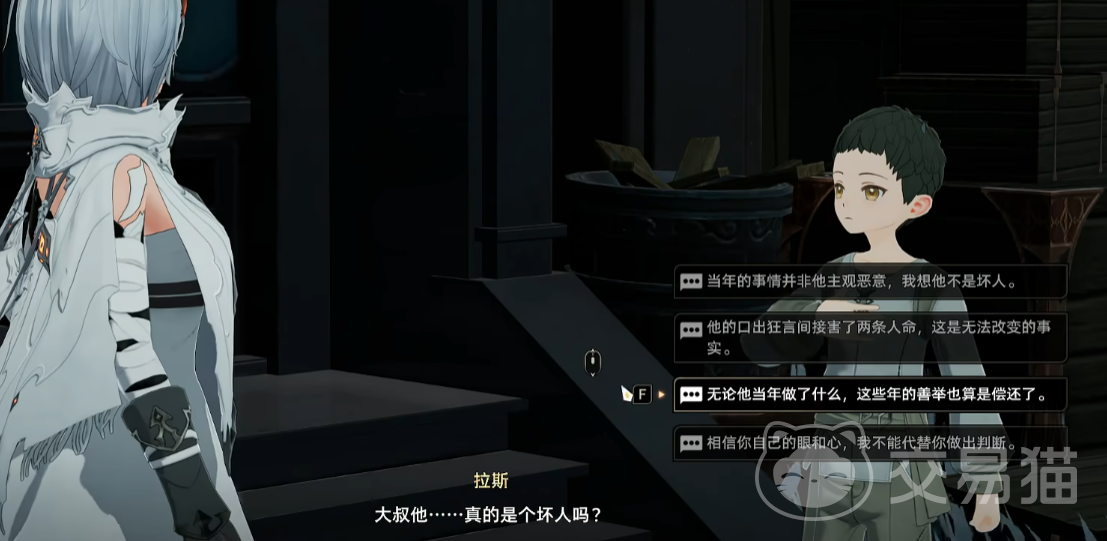 最后面对拉斯提出的问题——“多纳特是坏人吗?”,推荐选择第三项:“无论他当年做了什么,这些年的善举也算是偿还了。”此选项有助于提高道德属性。值得注意的是,“二重螺旋”中的多个支线任务存在隐性关联,某些任务中提及的人物或背景事件,往往会在其他任务中得到呼应与补充。