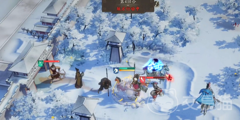 首回合操作中,暂不安排关羽直接参战,而是继续推进使其进入战斗状态,为后续触发再动效果做准备。接着释放“兵贵神速”技能,使关羽迅速抵达城门处两名守卫之间。此时,一名守卫会主动绕后夹击,而城内援军因距离过远无法及时支援。抓住这一时机,先由吕玲绮与关羽联手发动合击,迅速消灭背后敌人,再由张辽加速上前,再次配合关羽完成第二波合击,清除另一侧守卫。随后关羽继续前进至营寨入口,与敌方主将展开交锋。凭借其较高的生命值属性,关羽能够有效吸引并承受大量伤害,同时将敌方单位聚拢,为接下来的集火创造条件。