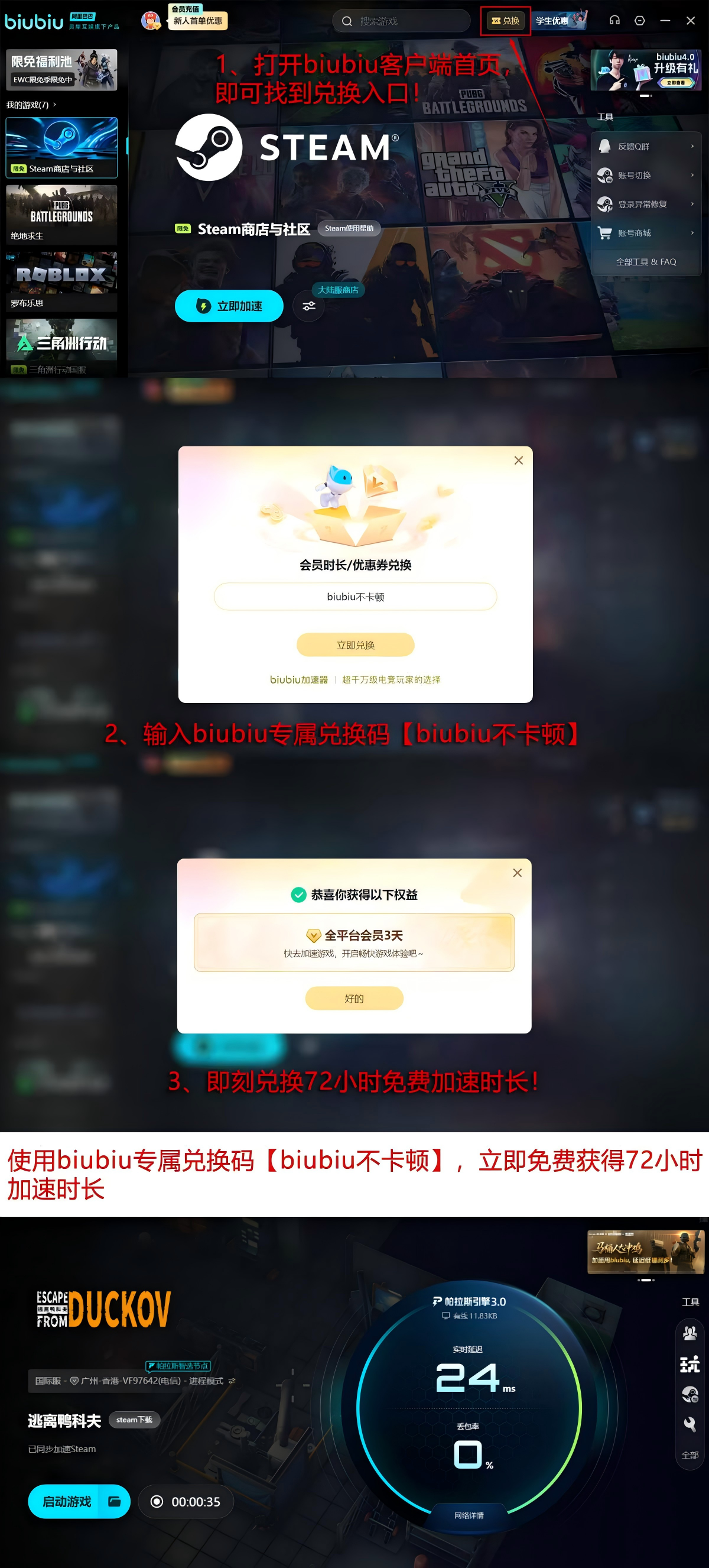 对于新用户而言,平台还提供了实用的试用福利。注册登录后即可领取24小时免费加速服务。若希望延长使用时间,只需进入首页点击兑换按钮,并输入口令【biubiu不卡顿】,便可额外获得72小时的加速时长,助力玩家畅快体验高强度对战内容。