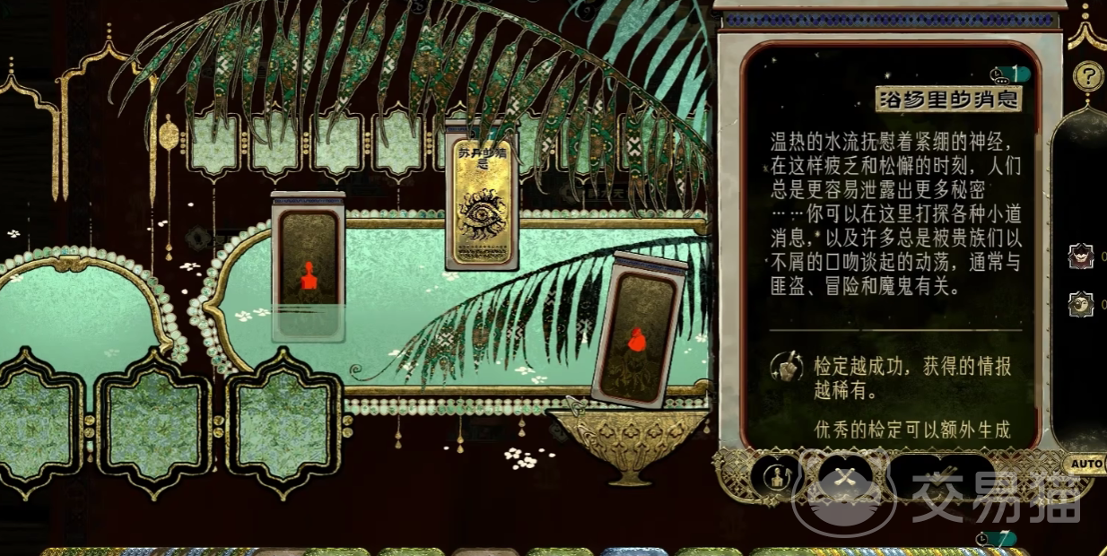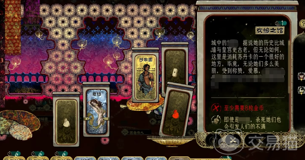 第二种方式发生在欢愉之馆场景中。玩家可通过拒绝女性角色的邀约来直接消除一张猜忌卡。然而,此举会导致不利传闻扩散,同时限制欢愉之馆的部分功能开放。特别需要注意的是,一旦后续获得白银品质或更高级别的纵欲类卡牌,将无法正常处理,可能进一步加剧资源管理压力。