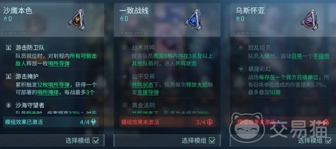 要成功激活模组,必须理解其触发机制。每个编队仅能装备一个模组,且队伍中需包含足够数量具备对应标签的角色。例如,若选择装配“沙鹰模组”,则队伍内至少要有四名带有“沙鹰”标签的单位,缺一人便无法开启加成效果。玩家可在部署界面点击模组图标查看具体需求人数,并优先安排符合条件的角色入队,确保基础增益稳定触发。对于新手而言,推荐优先使用沙鹰模组,因其前期赠送角色较多,达标门槛低,便于快速体验模组带来的实战优势。