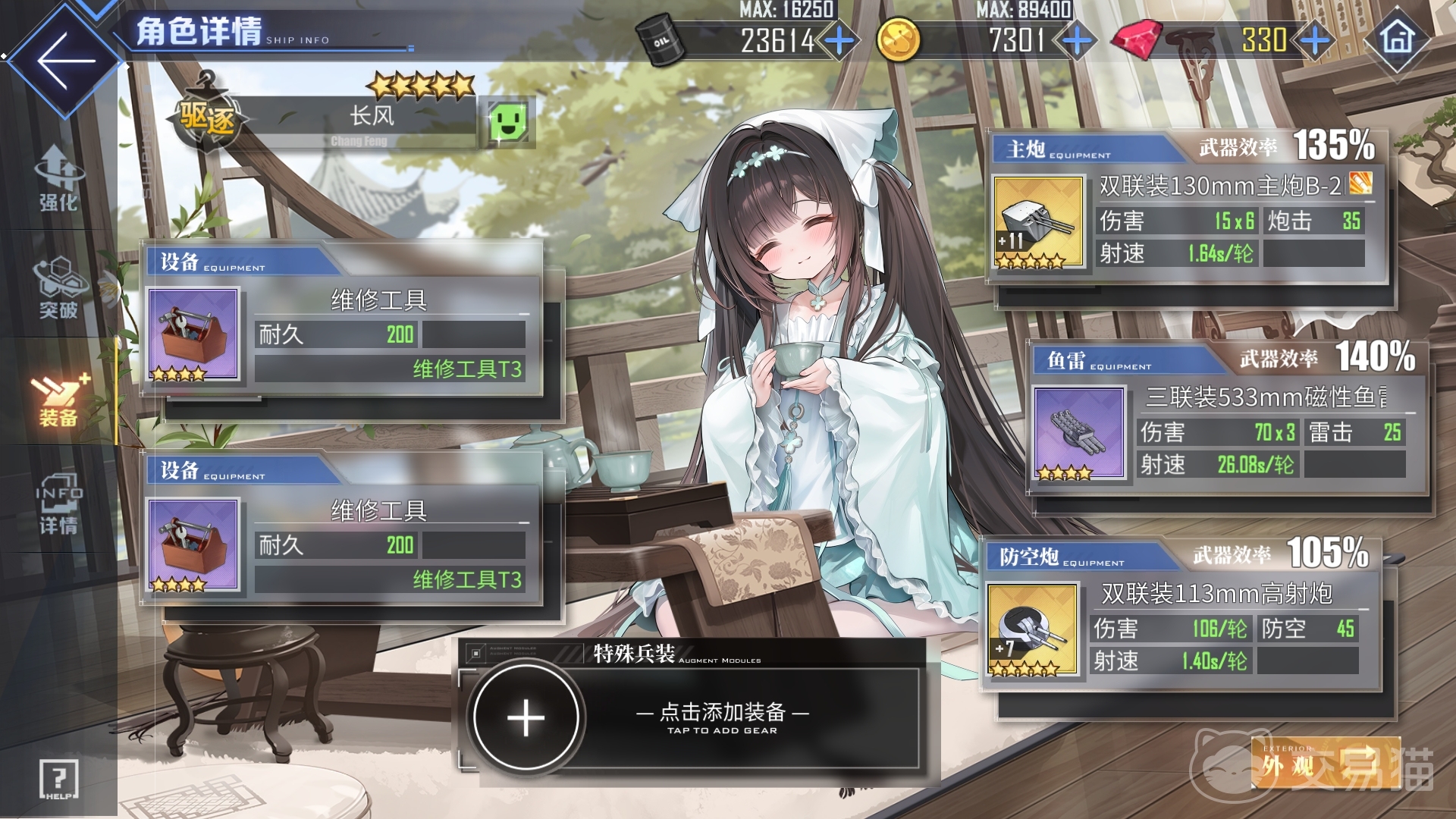 关于装备配置,推荐优先使用彩秋月炮以最大化弹幕伤害,若资源有限,B13双联装主炮也可作为替代方案。鱼雷方面建议配备金四磁,若队伍中前排无其他高雷击角色携带金四磁改,则可由长风装配以提高输出效率。防空武器首选彩76毫米炮,设备栏位推荐双饭盒组合;若任务对反潜有较高要求,可调整为一饭盒一刺猬弹的搭配。低阶配置下,主炮可选用紫127改或紫双联120,鱼雷采用紫三磁,防空炮尽量装配金双联113,条件不足时可用紫双联113过渡,设备搭配方式与高配保持一致即可。