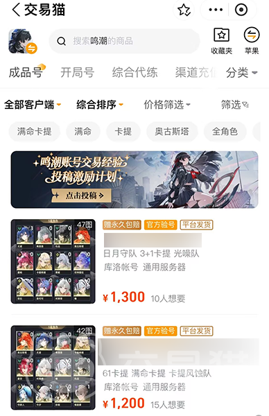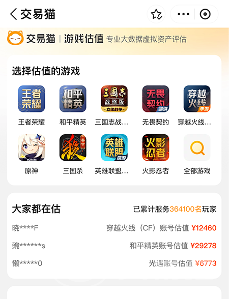 以上就是鸣潮估号的具体操作,交易猫早已上线了免费账号估价服务,现在,支持估值的游戏数量增加了,甚至覆盖了大部分的游戏。玩家筛选一些游戏账号基础条件之后,平台自动给出合理报价,比如特别的武器、服饰、阵容组合方式等。此外,它支持官方验号和永久包赔。