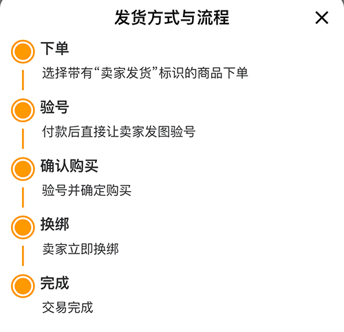 首先,账号交易流畅简化。高价值账号交易只需要五步,买家下单之后,客服进行验号和出局验号报告,买家确认是否购买,然后进行账号信息发送,进行账号换绑和转移,买家登录账号,完成交易即可。