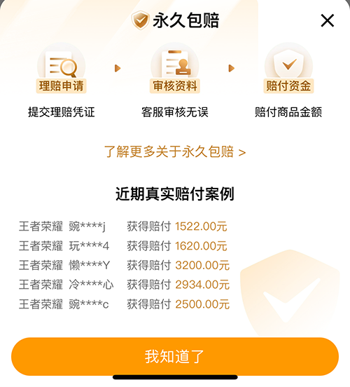 第二,账号售后大部分支持永久包赔。买家认准永久包赔的标识,当账号被找回、删除、封禁之后,大家可以提供相关的凭证,联系客服索赔,进行交易安全性赔付,将在1-3个工作日进行审核理赔,获得订单金额的全额赔付。