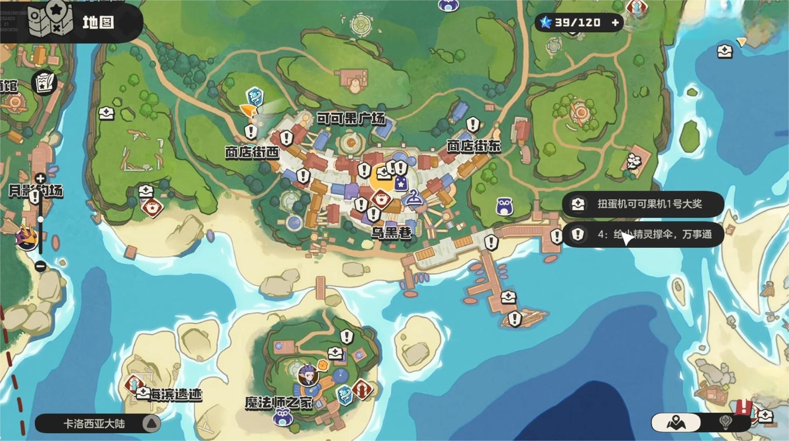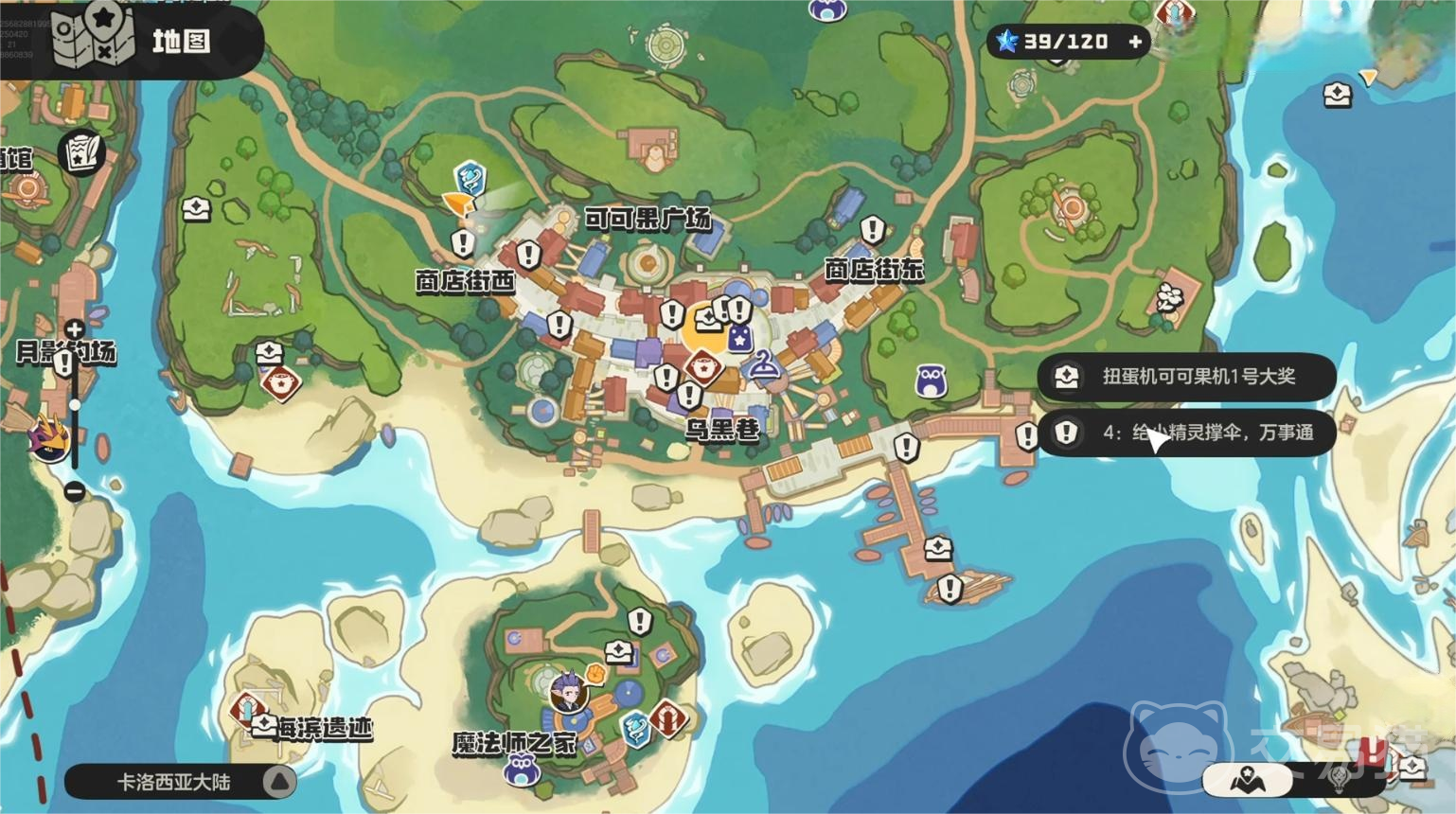 位于可可果广场附近的任务点也提供了多种互动玩法。比如“为小精灵撑伞”这一任务,只需与NPC对话并按要求操作,帮助特定精灵遮阳避雨,即可完成挑战并领取成就奖励。此外,还有需要配合特定宠物参与的场景互动,例如击打鼓类机关,完成后可开启宝箱获取实用道具。