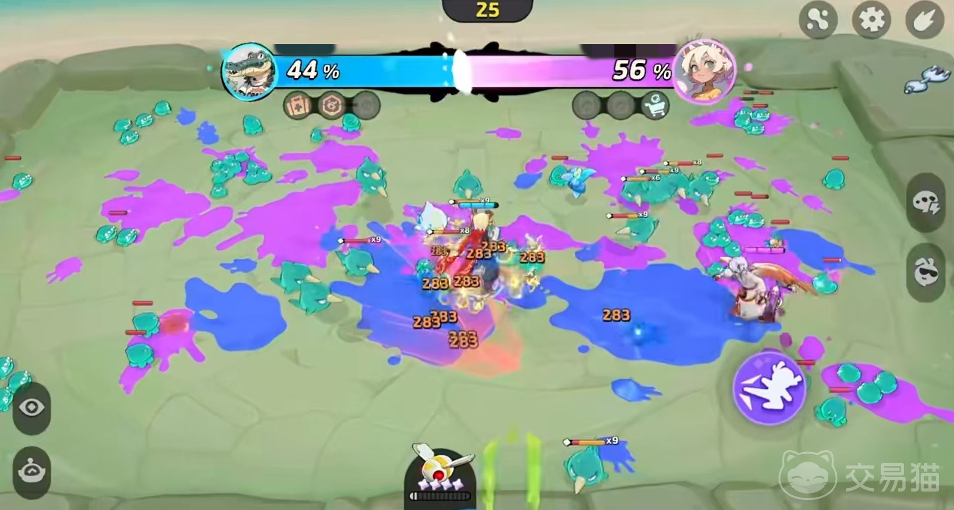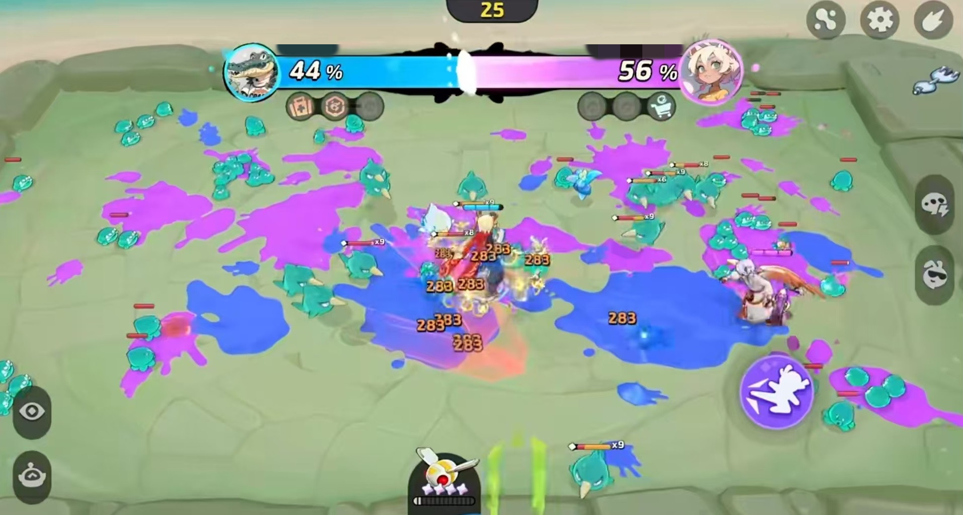 本作的核心机制别具一格,胜负由涂色区域占比决定。玩家通过击败敌人扩展己方颜色覆盖范围,取代传统对战模式,带来全新的策略维度。武器获取采用动态分配机制:系统依据角色当前血量排名发放装备,玩家需使用钩子抓取并即时投入战斗,这一设计显著提升了操作与战术选择的深度。游戏融合了涂色竞技、弹幕闪避、Roguelike成长三大元素,要求玩家在躲避密集弹幕的同时,灵活构建专属流派,平衡走位技巧与装备搭配,实现操作与策略的双重满足。