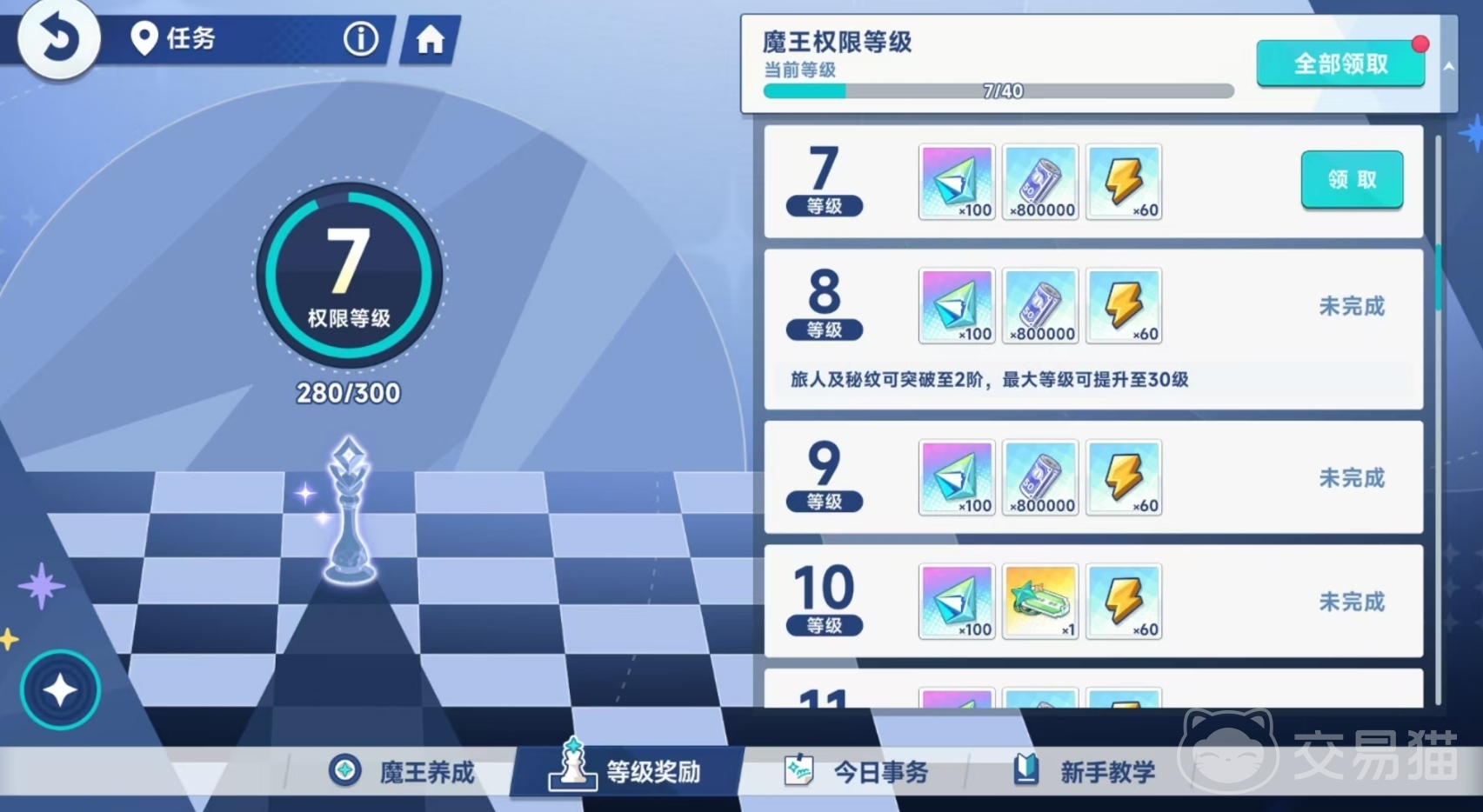 第三种方法是在“魔王养成”界面推进任务进度。该系统包含多个章节的任务线,涵盖非战斗与低难度战斗目标,即便是实战环节也仅需通关最低难度副本即可满足要求。每完成一个章节的所有任务,不仅能获得大量权限经验,还可领取包括稀有资源在内的高价值奖励,性价比极高,建议优先推进。此外,每当权限等级成功提升后,记得前往等级奖励页面领取对应阶段的回馈物资,如星之砂、体力药等珍贵道具,均为日常培养不可或缺的资源。