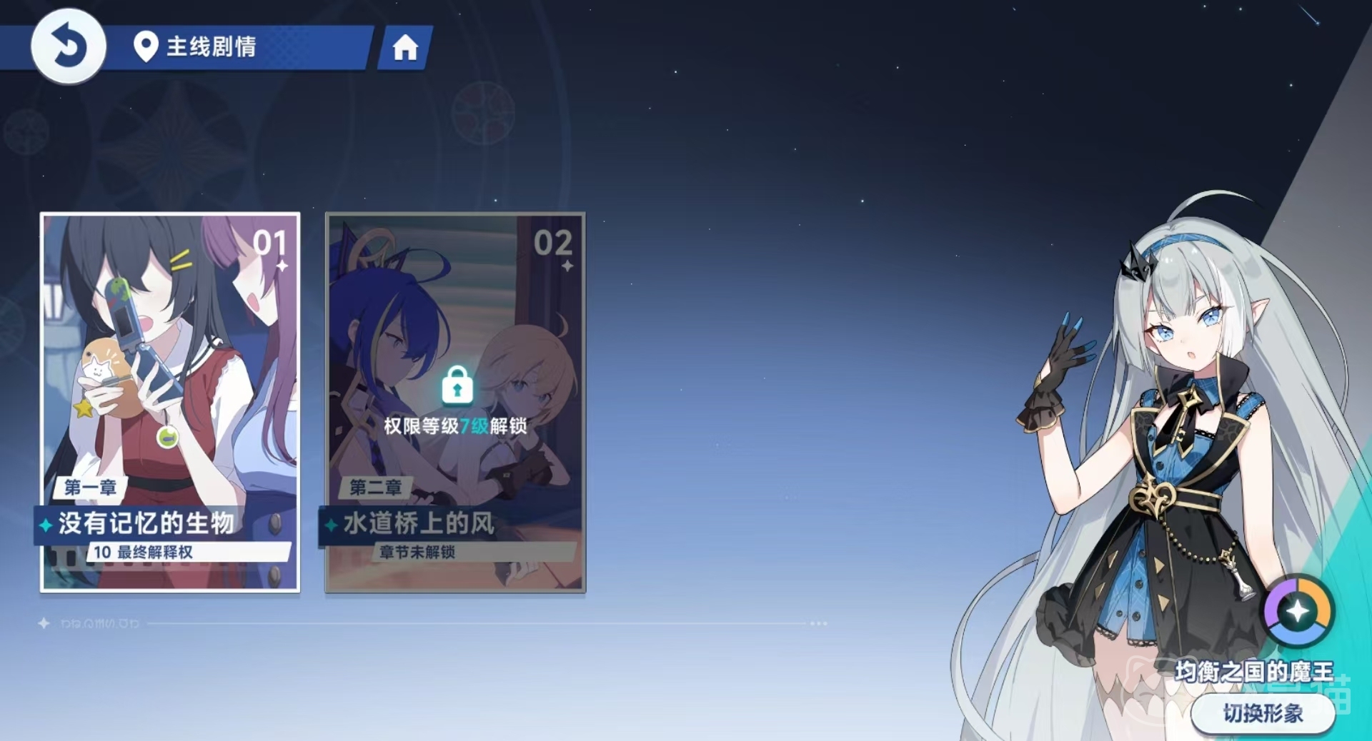 游戏开局会引导玩家经历一段强制剧情流程,期间将逐步介绍核心战斗机制。完成教学后即可进入自由操作阶段,正式开启开荒进程。此阶段最关键的行动是提升“魔王养成”中的权限等级。该等级直接影响可解锁的主线章节、开放的系统功能以及资源获取效率,属于前期必须优先推进的核心目标。与此同时,建议同步推进主线任务,游戏中的剧情以视觉小说形式呈现,穿插少量战斗挑战,每完成一个章节节点,还能获得星之砂作为奖励。