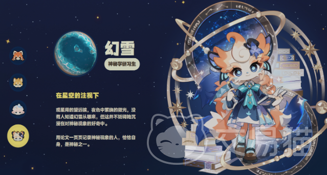 幻雪给人以神秘莫测的印象,原型为一只九尾狐,职业是神秘学研习师。关于他的来历无人知晓,随身携带的笔记本中写满了与宇宙奥秘相关的线索。每当有人提出难以解释的现象时,他总能娓娓道来,并流露出对未知世界浓厚的兴趣。跟随他的指引,或许能揭开游戏中隐藏的奇妙事件与深层剧情。