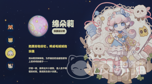 棉朵莉是一位温柔细腻的女孩,原型是一只小羊。她热衷于手工制作玩偶,习惯用针线记录生活中的美好瞬间。无论是品尝到美味的奶油蛋糕,还是看到夕阳映照下的野花,她都会将其转化为独特的手工艺品。玩家在游戏中若希望获得个性化的装饰物品,可以考虑委托她定制专属摆件。