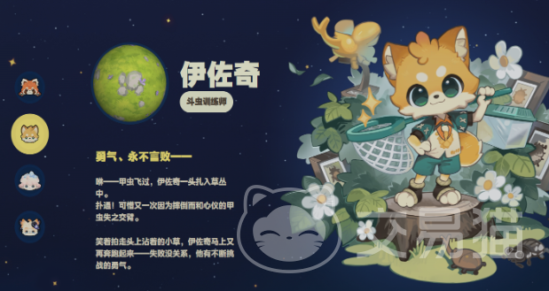伊佐奇充满活力,是一名专业的斗虫训练师,形象源自一只浅黄色的狐狸。他常穿着绿色运动服,手持捕虫网,行动迅捷如风。无论是在森林深处搜寻罕见昆虫,还是探索未知区域,他都能带来十足的冒险氛围。他的存在不仅让野外旅程更加生动,还可能引导玩家发现隐藏在环境中的特殊彩蛋或资源。