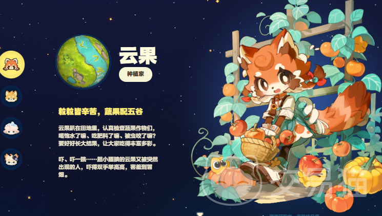 在田间最常见的身影便是云果,她身穿便于活动的浅褐色布衣,衣角常带着泥土与草叶的痕迹。身后那条蓬松的橙色狐尾会不经意地轻拂过作物边缘,仿佛在默默守护着每一株幼苗。每天清晨天未亮时,她便提着藤编小篮开始巡田,仔细检查每一片叶子的状态。一旦发现虫害迹象,便会从篮中取出亲手调制的天然驱虫剂,动作细致而专注,展现出对土地深厚的关怀。