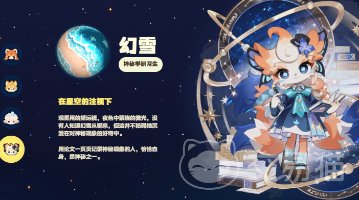 每当夜幕降临,幻雪便会出现在高地之上。她身披一袭深色长裙,裙面上点缀着银色星辰图案,随风飘动宛如披着整片夜空。手中的观星望远镜始终对准遥远星河,九条洁白的狐尾在身后舒展,尾尖偶尔闪烁出如星光般的微芒。她言语不多,多数时间沉浸在星空的观测中。若有人夜晚迷路,她会轻声指引方向,声音虽冷,却令人感到安心,随后便再次仰望苍穹,仿佛在解读宇宙传递的无声讯息。