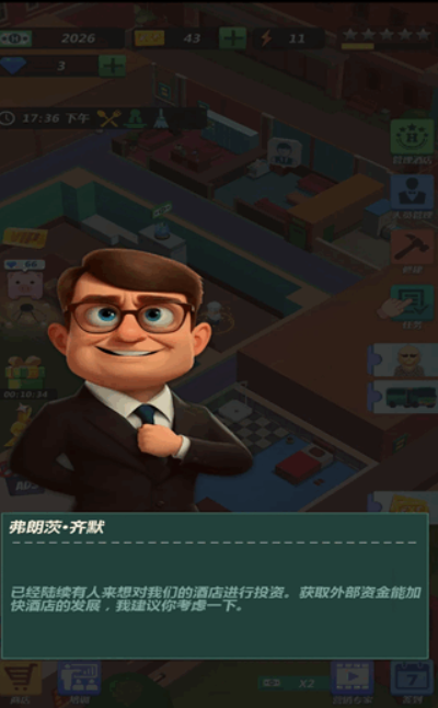 为了提升入住率,玩家需策划多样化的营销方案,例如推出限时优惠套餐或会员服务。同时,招聘并培训服务人员也是关键环节,优质的服务水平有助于提高顾客满意度和口碑传播。随着收益增长,会有虚拟投资人加入,为酒店扩建提供资金支持,助力规模持续扩大。