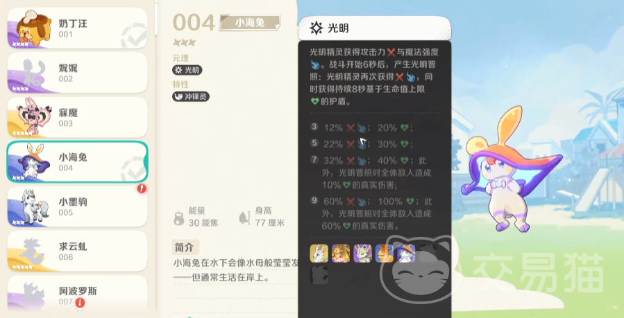小海兔虽然被设定为栖息于陆地的精灵,但其外形带有水下发光特征,视觉辨识度较高。在游戏中,它主要定位为前排突击型单位,适合部署在战斗前线。凭借较高的生命值和不俗的近战输出能力,小海兔能在冲锋位有效承担伤害并打出可观的物理压制效果,是前期推图过程中值得信赖的角色。