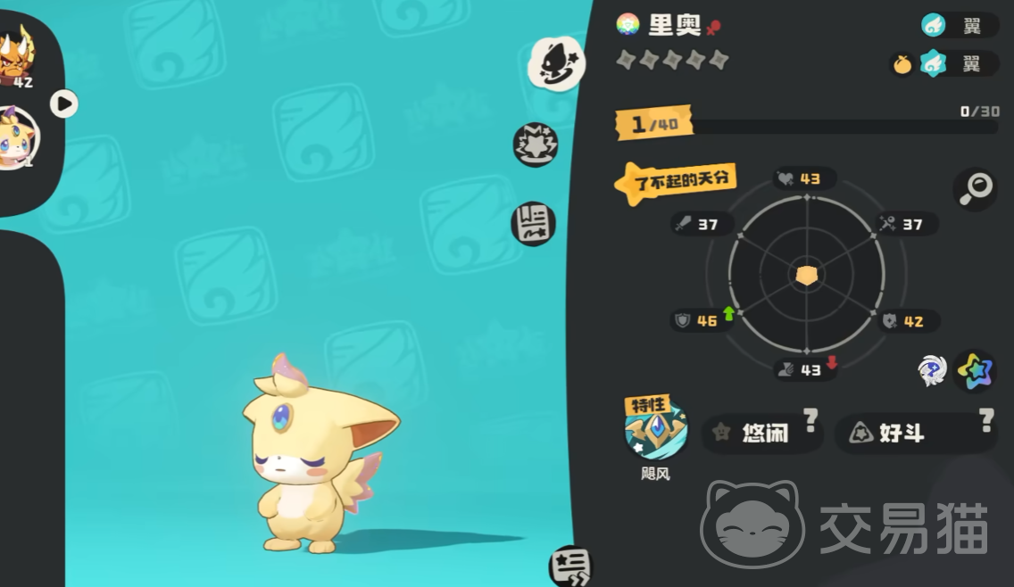 里奥属于翼属性精灵,拥有“飓风”这一独特特性,性格偏向悠闲与好斗。其基础数值方面,物理攻击和魔法攻击均为37点,生命值达到43点,物防与魔防同为46点,速度同样为43点,在初级形态中具备良好的成长潜力。